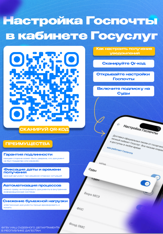 Сообщаем, что участники процесса могут быть извещены о времени и дате судебного заседания, путем получения извещений через единый портал Госуслуг, раздел «Госпочта». Для получения извещений перейдите в личный кабинет портала Госуслуг по ссылке QR-кода и дайте согласие на получение писем от суда.